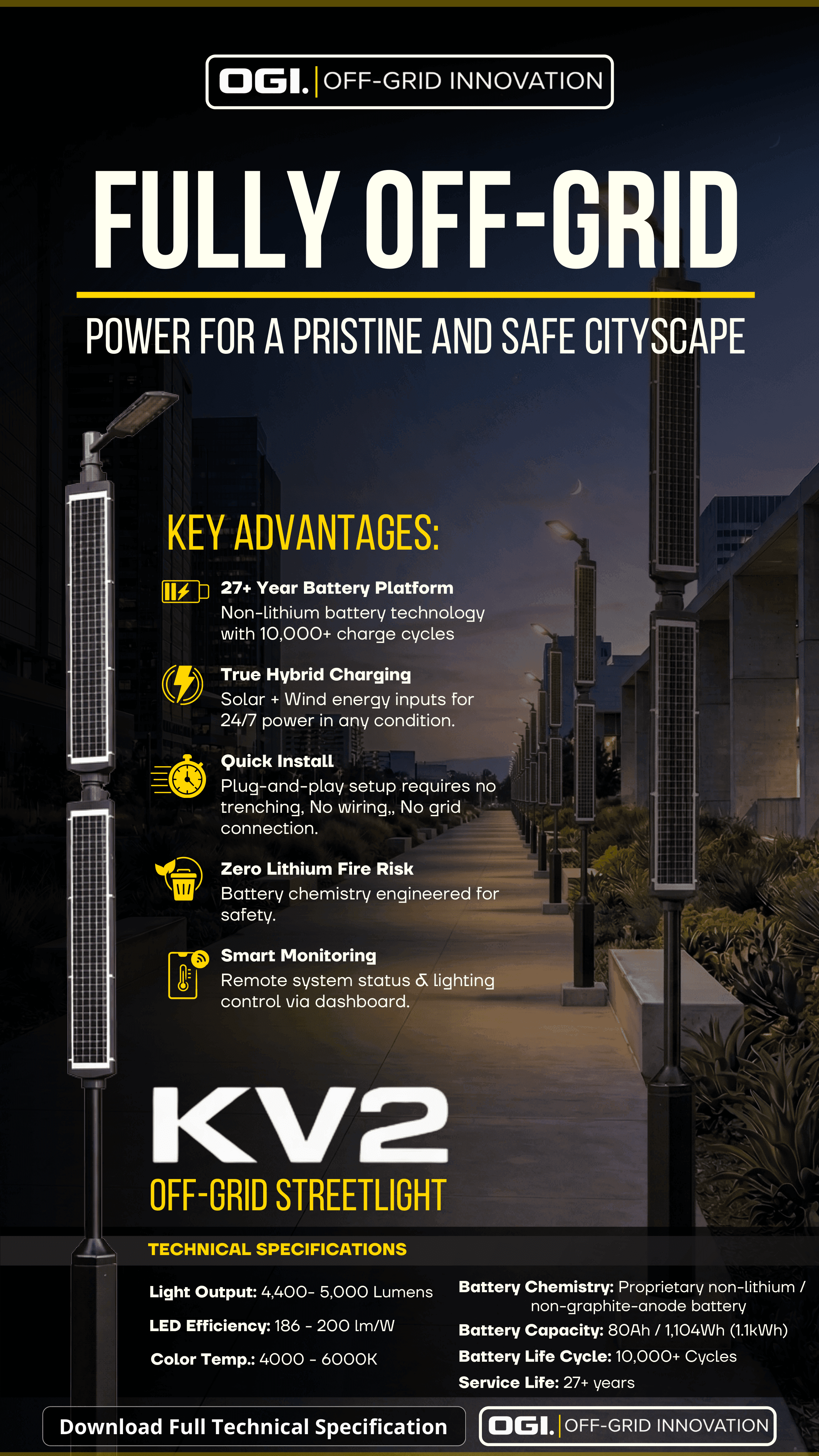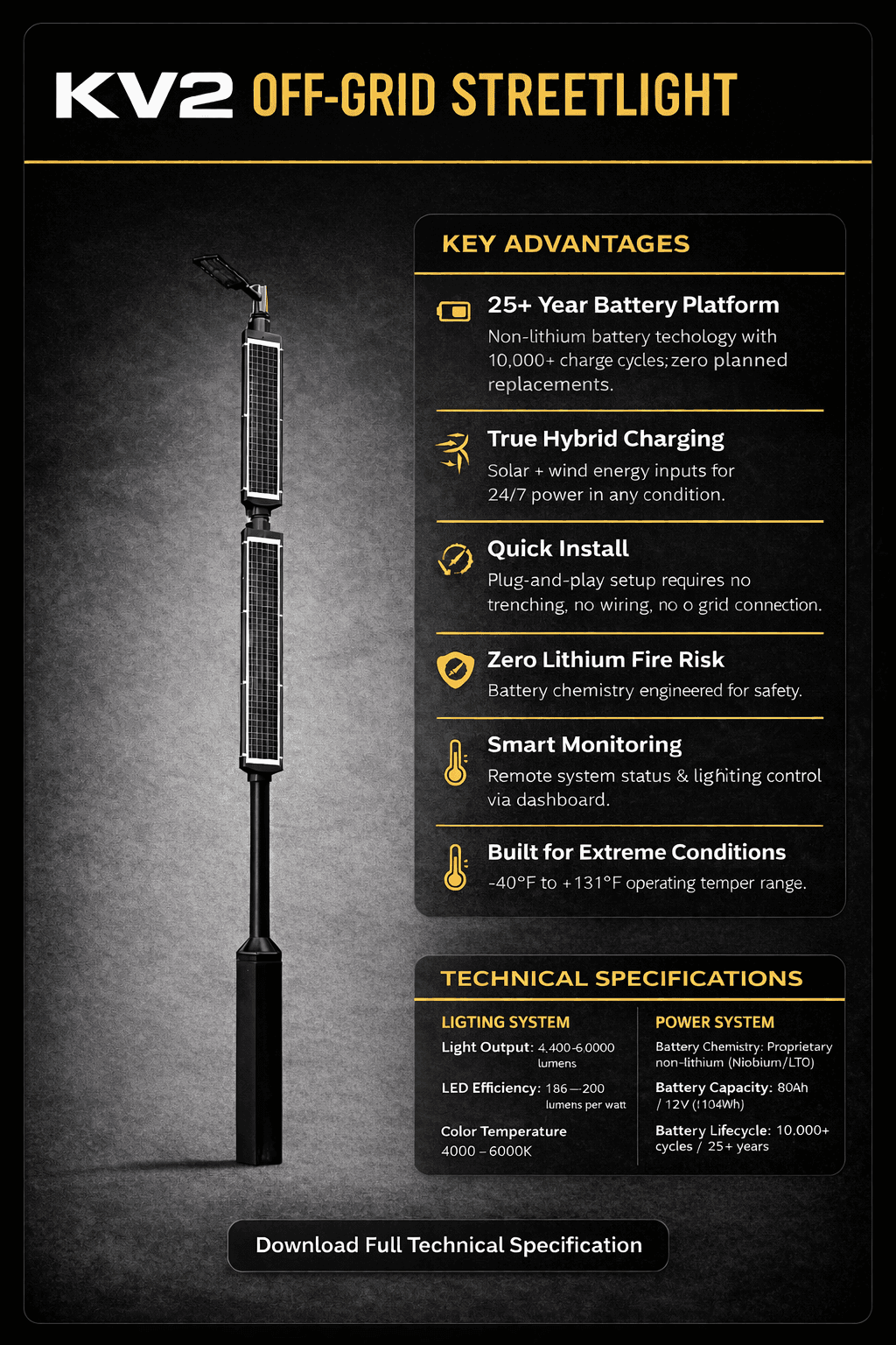 Engineered for off-grid reliability. KV2 delivers permanent LED lighting anywhere—street, park, or path—without trenching or grid connection.